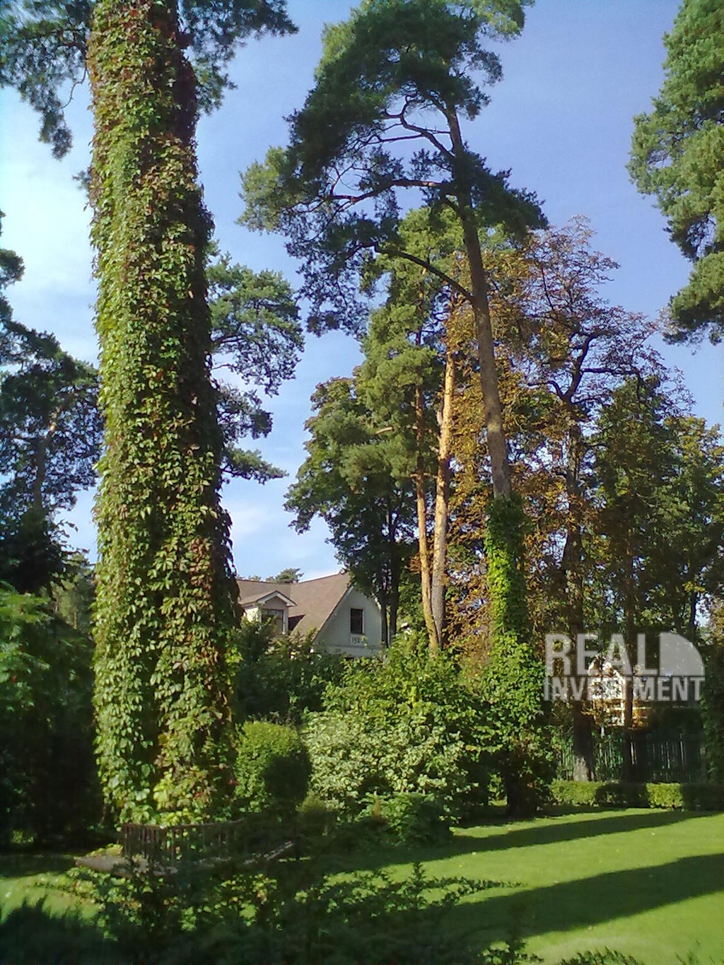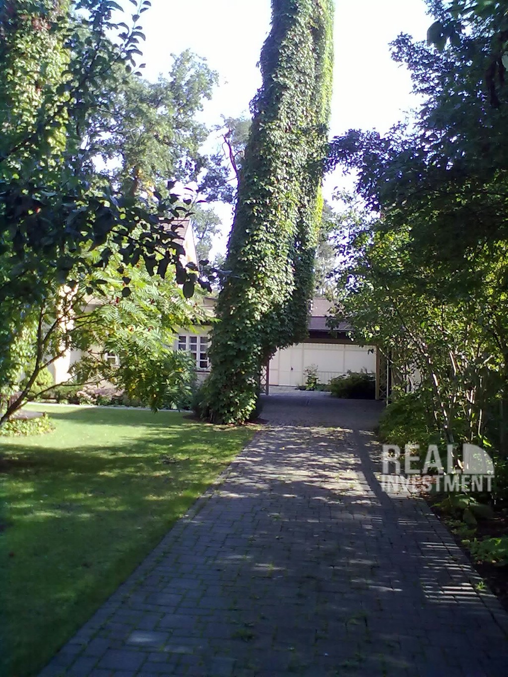 Благоустроенный участок. Ухоженный газон, декоративные деревья, дорога выложена брущаткой. Автоматические ворота. |